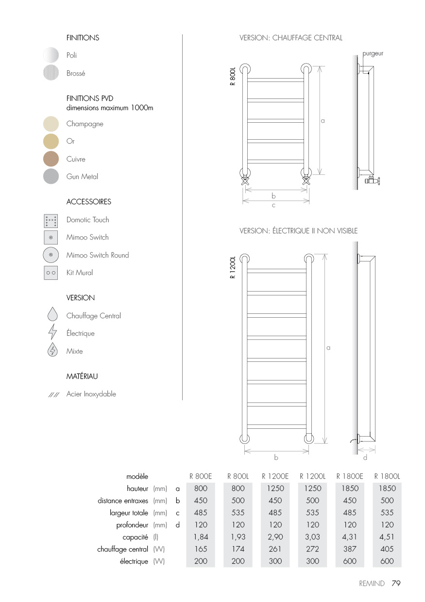 Disponible en acier inoxydable brossé, poli, or et vieil or, en version chauffage central ou électrique (élément électrique occulte).